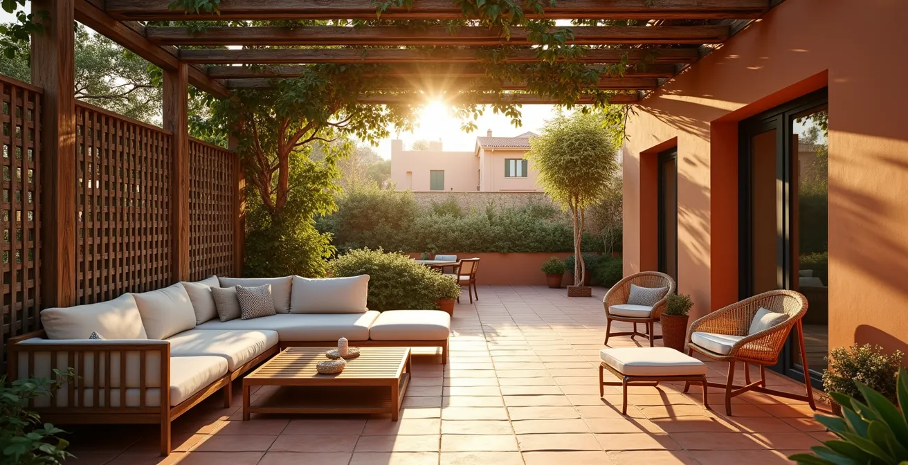 La privacidad nocturna, en cambio, requiere un enfoque diferente centrado en la gestión de la luz. La iluminación estratégica es tu mejor aliada. En lugar de una luz potente en el techo que ilumine toda la terraza y te exponga, opta por múltiples puntos de luz baja y cálida. Guirnaldas de luces, apliques a ras de suelo o lámparas portátiles colocadas estratégicamente crean islas de luz acogedoras y dejan otras zonas en penumbra. Esta técnica no solo genera una atmósfera íntima, sino que también dificulta la visión desde el exterior, ya que el ojo humano tiende a centrarse en los puntos más brillantes.